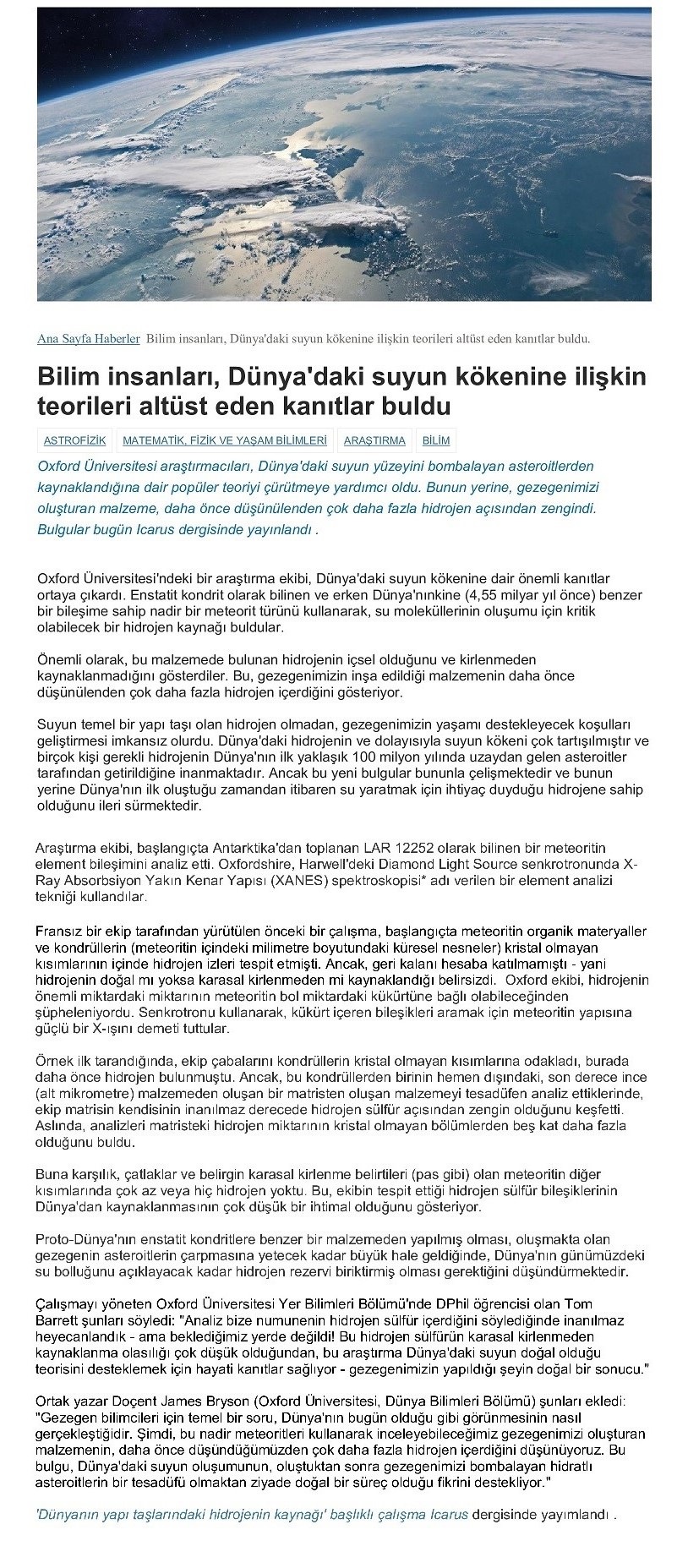 tarihli Oxford Üniversitesi araştırması ise Hidrojen'in Dünya'ya sonradan